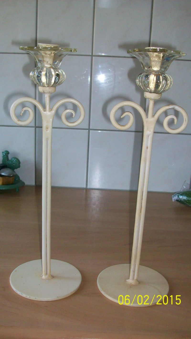 2 Brocante gietijzeren kandelaren met glazen kaarsenhouders 20€